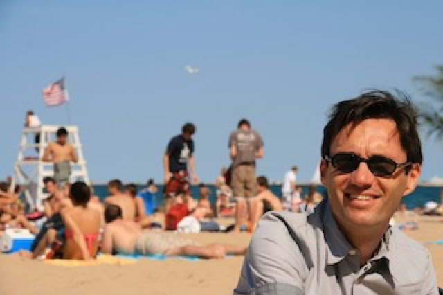 En milieu d’après-midi, direction ... LA PLAGE ! Quand même, c’est génial : il fait beau, on est en plein Chicago, le J Hancock Center se dresse juste à côté ... et on est à la plage, avec le Lac Michigan qui ressemble à la mer, les beaux maîtres-nageur sur leur guérite blanche, le drapeau américan qui flotte sur fond de ciel bleu, les jeunes et beaux américains qui jouent sur la plage, etc... Matthieu et moi nous baignons dans le Lac Michigan. L’eau est plutôt bonne.