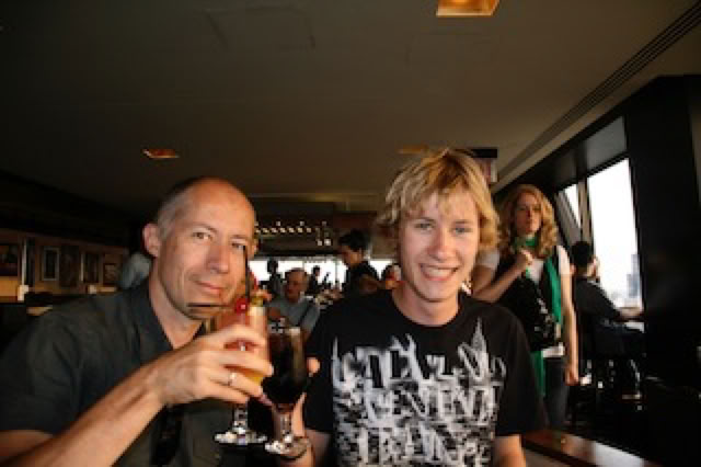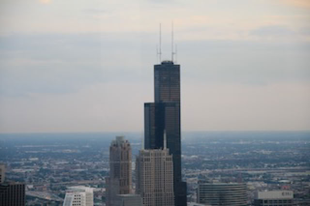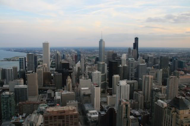 En fin de journée, plutôt que de payer pour prendre l’ascenseur à touristes, Pierre nous emmène direct au «Signature Lounge» au 96e étage du John Hancock Center (340 m) : là, on prend un verre tout en admirant tranquillement le panorama depuis nos fauteuils. La plage où nous étions cet après-midi est toute petite vue d’en haut. Le jour commence à tomber ...