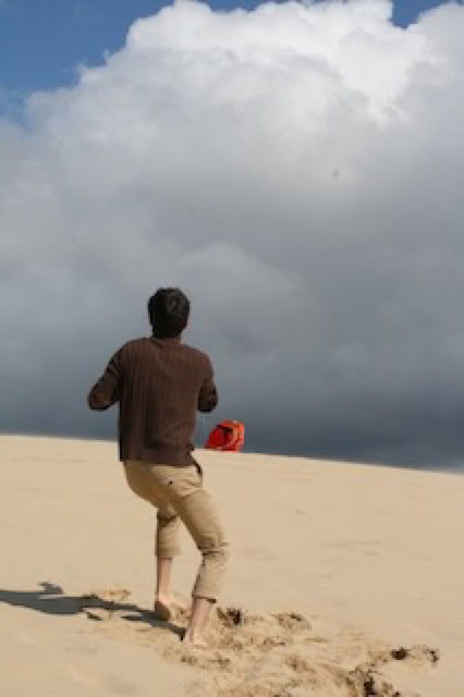 Grasse matinée pour la première journée sur place ! On traine un peu, Pierre va faire un tour à vélo, on va à la maison de presse (où j’achète un magazine formidable avec les voitures des années 70 ... Peugeot 604, Renault 30, Simca 1307, GS, CX 2000, etc. Souvenirs !). Salade de riz ... re-farniente, télé ... et c’est parti pour un tour à vélo à la dune du Pyla. On connait bien la route. Ca monte un peu et après évidemment il faut escalader la dune. On se trouve un coin tranquille avec toujours cette vue unique sur le Bassin d’Arcachon, le Cap Ferret et le Banc d’Arguin. Il y a du vent, l’occasion de sortir le cerf-volant : ça tire fort sur les lignes !