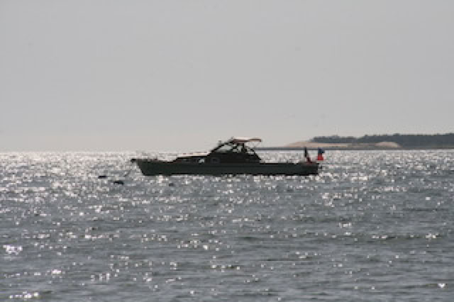 Ce tour de bassin ne fait pas 90 cm, mais plutôt 74 km, retour en bateau non compris. Levés nettement plus tôt que d’habitude (9h ...), petit déj. et mise en route. Sur le première tiers, c’est la traversée d’Arcachon, La Teste, Gujan ... rien d’extraordinaire, surtout quand on hésite sur la bonne piste cyclable à prendre. Ensuite, c’est l’interminable ligne droite qui longe le fond du Bassin : bien refaite, c’est plutôt agréable. Il ne fait pas trop chaud car le ciel est couvert en début de journée. Histoire de pimenter un peu le parcours, je fais de temps en temps la course avec Matthieu : rien à faire, il accélère mieux ! Pause déjeuner en terrasse d’un restaurant d’Andernos près de la jetée. La mer est ... invisible : marée basse et fond de bassin à découvert, sauf les quelques chenaux. On reprend les montures, cette fois jusqu’à la presqu’île du Cap Ferret. On s’arrête pour profiter de cette belle plage sur l’Océan. Plutôt agité l’Océan d’ailleurs. Le ciel est maintenant totalement découvert et il fait chaud : c’est bon, sur la plage. Retour aux vélos pour une dernière ligne droite jusqu’au Cap et la jetée Bélisaire. On prend la navette du retour. Toujours une très belle vue, depuis l’arrière du bateau, sur le Cap Ferret et en face, la Dune du Pyla.