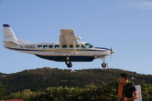 Nous admirons aussi la courte piste de l'aérodrome: l’approche est spectaculaire car les avions doivent survoler la ville à très basse altitude avant de faire un virage pour se jeter sur le seuil de piste entre deux collines. L'autres extrémité donne directement sur la plage. On regarde un Cessna décoller ... et un iguane traverser la route.