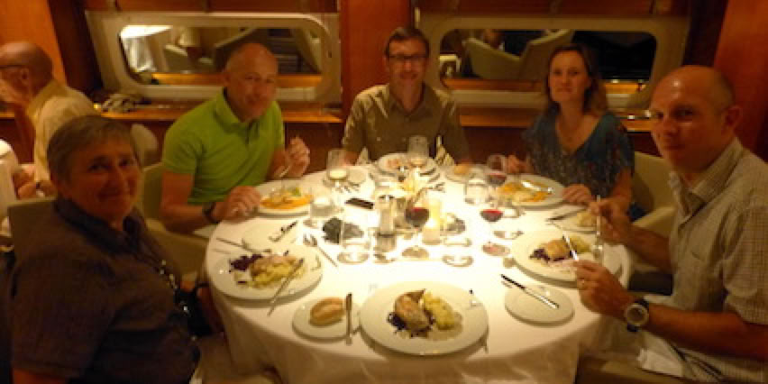 Ce soir là, c'est le repas du commandant: tout le monde est très bien habillé, voire en tenue de soirée. Le commandant est évidemment en grande tenue blanche ... mais Charles, un des passagers avec qui nous avons fait connaissance, s'est mis lui aussi en tenue de commandant de la Marine étant lui-même commandant de marine de réserve.