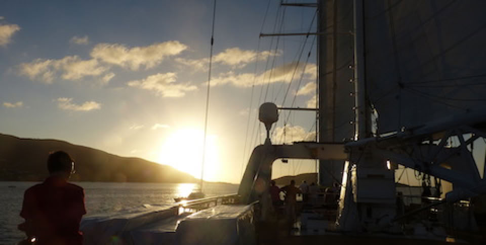 L'appareillage du Ponant est grandiose : dans ce paysage d'îles de carte postale, le Ponant hisse toute la voilure et commence à glisser dans la baie avec le soleil couchant: un vrai moment magique et l'on pourra voir le soleil littéralement tomber dans la mer sur un fond de ciel rouge-orangé.