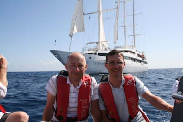 La météo ne permet pas de faire la baignade en pleine mer prévue, mais pour 'compenser' , le commandant organise une sortie en Zodiac pour admirer et photographier le Ponant sous voile. Et c'est vraiment un moment magique de voir, depuis la mer, ce magnifique navire blanc avec ses trois grands voiles et ses deux focs hissés, sous le soleil et sur une mer bleue turquoise. Après deux tours du bateau et une cinquantaine de photos plus tard, il faut remonter à bord, avec une bonne houle, sur la marina (la plage arrière du bateau).