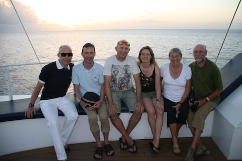Champagne sur le pont Antigua, puis repas au restaurant Diamant avec nos amis belges Rose-Marie et Roger, et le jeune couple Fabienne (juge d'instruction, ça impressionne !) et Charles (le commandant) !