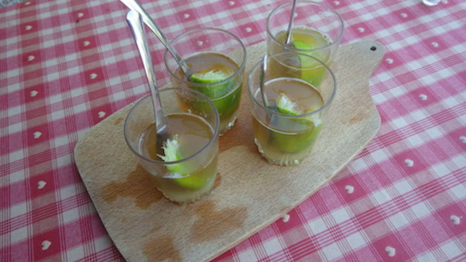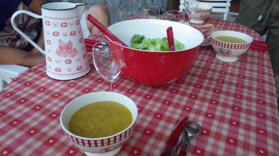 Après un bon Planteur préparé par Christophe, repas soupe-jambon-salade ... et Christophe se fait un peu tirer l’oreille pour manger sa soupe :)