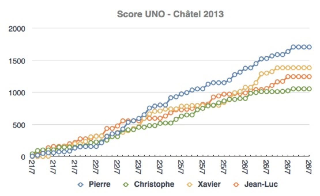 Non ... alors ci-dessous le résultat du tournoi de Uno (pour les novices du Uno, le score le plus faible gagne). Vainqueur, donc, Christophe !