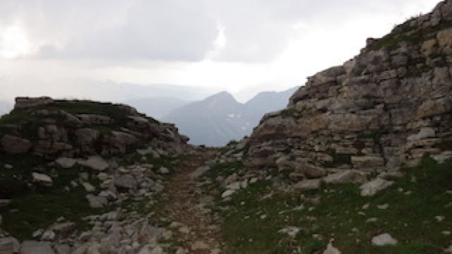 Il commence à pleuvoir, il grêle, même, et le tonnerre se rapproche franchement. La situation est sérieuse ! J’ai la chance d’avoir mon Kway pour ne pas avoir froid car cette fois il pleut franchement et le chemin se transforme en petit ruisseau boueux. Je ne vois plus Pierre, nettement plus bas, ni Christophe et Xavier. Pour ma part, je descends très prudemment pour ne pas me blesser en plus de l’orage ! Je me dis qu’il ne fera pas bon être sur la crête à cause de l’orage. C’est à ce moment précis qu’un éclair tombe vraiment très près avec un coup de tonnerre immédiat : en fait, un peu plus bas, Pierre, Christophe et Xavier ont vu cet éclair s’abattre juste un peu plus loin sur le chemin ! Christophe a sans doute reçu une décharge indirecte car sa machoire a claqué involontairement. Voyant cela, ils se sont accroupis ou allongés dans l’herbe pendant une dizaine de minutes, comme c’est conseillé dans ces situations (normalement, il faut aussi se débarasser de son sac ...). Pour ma part, je continue à descendre prudemment et nous nous retrouvons finalement au pied de ce chemin, avec un Pierre transi de froid et d’émotions (je lui passe mon KWay ... que j’étais le seul à avoir pris ... pas bien !).