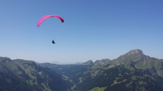 Je pratique l’avion, mais ce n’est pas comparable : c’est vraiment la sensation de voler comme un oiseau, exactement comme dans mes rêves (Xavier aura la même sensation). Après plusieurs cercles pour prendre une ascendance et remonter un peu, Christophe me fait pleinement profiter du paysage et du vol. Mais comme j’ai parlé au moniteur de mon activité aéronautique, celui-ci me propose de faire quelques ‘virages’ ... et là, c’est beaucoup plus violent : gauche, droite, gauche, droite, au moins 2g, plongée puis remontée vers le ciel bleu jusqu’à ce que la voile perde sa vitesse avant de replonger ! C’est à la fois éprouvant et extraordinaire de sensations. L’approche est plus tranquille et permet d’admirer Châtel vu d’en haut, y compris le chalet Madeline. Après plusieurs virages tranquilles pour perdre l’altitude et viser le champ d’arrivée au centre de Châtel, nous touchons le sol comme une fleur : juste debout, sans besoin de courir !