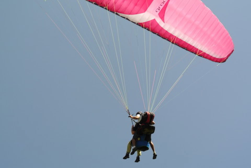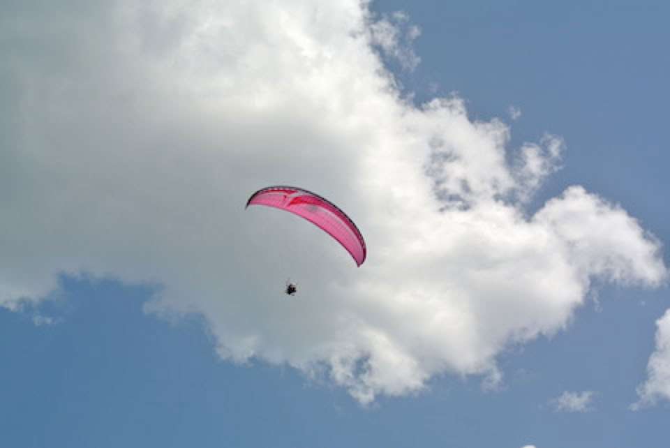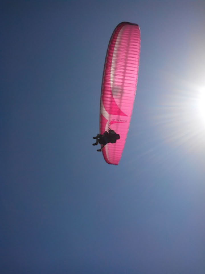 Je reste en bas, pour filmer le vol de Xavier vu du sol. Après 1/2h, nous voyons à nouveau la grande voile fushia se dessiner sur le ciel azur et quelques cumulus blancs : à son tour, Xavier profite de ces moments de bonheur ... et à son tour aussi de profiter de quelques virages bien sentis ! Xavier aussi se posera tranquillement, devant nous. A voir le sourire, on devine qu’il a lui aussi joui de ces quelques minutes trop courtes d’apesanteur ... avec sans doute moins de stress que moi au départ. Par contre, je ressens encore les effets des évolutions serrées !