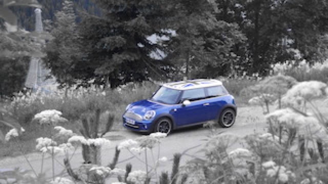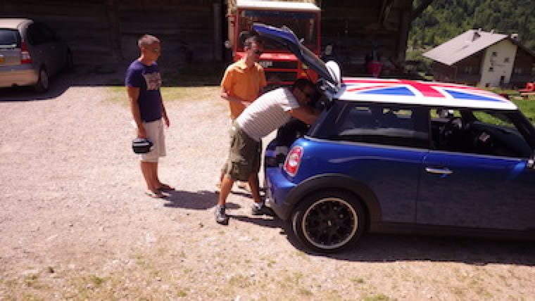 Enfin à la voiture, épuisés. Pour ne pas salir le cuir de cette belle Mini British, c’est en caleçon que nous prenons place, assis sur des cabas de courses. Ce sont donc quatre hommes torses-nus qui traversent Châtel dans cette Mini ... pas très discrète.
