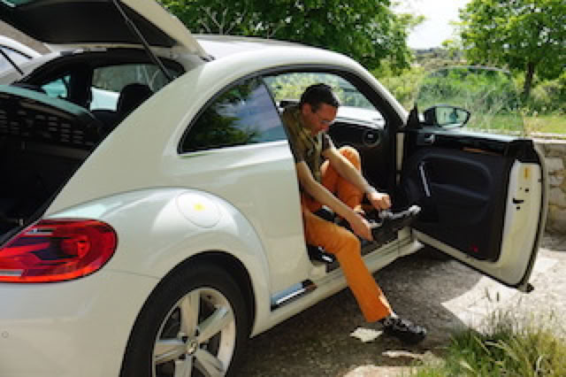 10h, il fait beau ! On file chez Hertz chercher la Fiat 500 que j’avais réservée. Pas de chance, ce sera une Panda grise. Arrivée sur le parking, Pierre me fait remarquer la superbe Coccinelle à côté de la Panda. Ok, ok, je retourne au comptoir pour faire l’échange (c’est juste 2x plus cher ... mais bon, on ne part pas souvent en WE !). C’est donc dans une belle Coccinelle Sport 2.0 TDI boite DSG avec toit vitré ouvrant que nous commençons notre tour dans le Sud.