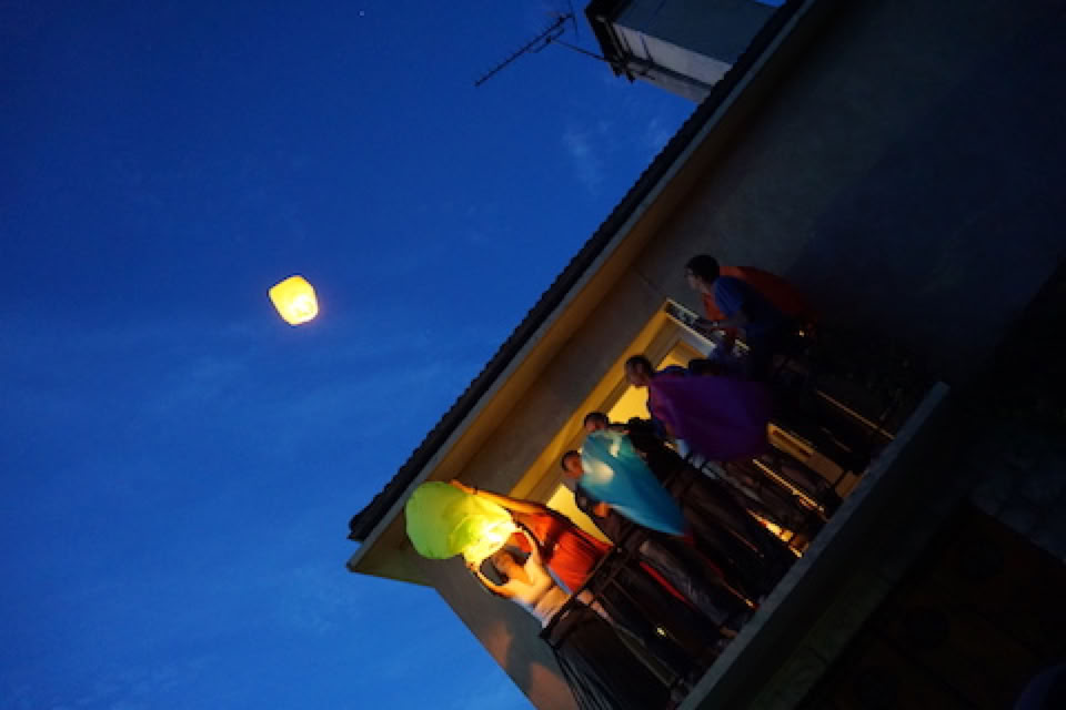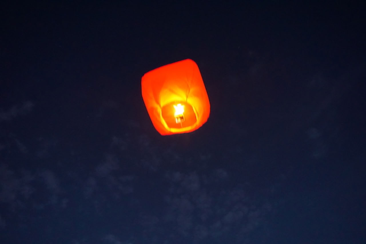 Petite pause avec un grandiose lâcher de lanternes de papier lumineuses que nous avons vu s’éloigner et monter jusqu’au ciel avec un émerveillement partagé. A priori, aucune chute d’avion n’a été signalée dans l’axe d’Orly cette nuit là !