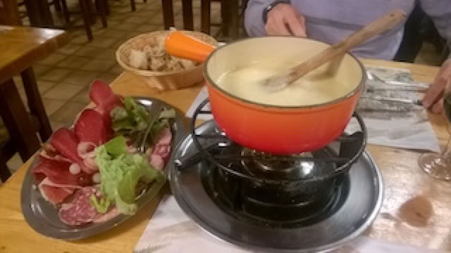 Dans la soirée, traditionnel repas de fin de séjour, à La Ripaille cette fois. Pierre fait l'effort de prendre une fondue (pour deux minimum) pour ne pas me priver Elle est excellente et passe sans problème !
