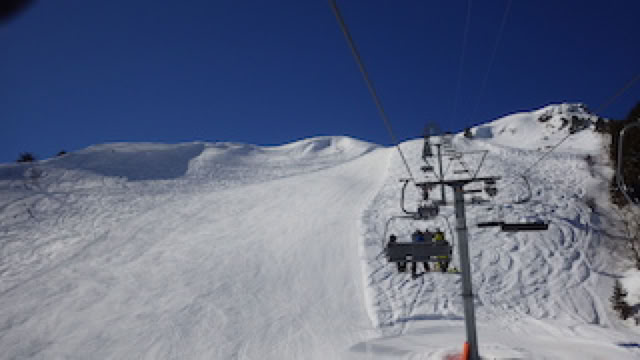 Pas de chance, le télésiège de Barbossine est en panne: nous prenons la navette jusqu'au Linga. C'est un peu le métro aux heures de pointes … La neige est excellente, le soleil brille ! Je me fais vraiment plaisir sur ma piste préférée, la Perdrix Blanche.