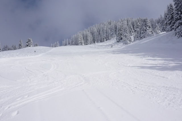 Retour quand même par Super Châtel, la liaison fonctionne à nouveau. Beaucoup de plaisir sur la piste bleue qui longe la rouge des Combes : large, personne, neige extraordinaire ! Puis descente par le chemin jusqu'à Chatel.