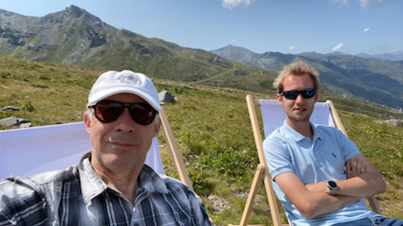 Après la longue distance de la veille et en prévision de la méga-rando prévue le lendemain, nous prévoyons un programme tranquille. Nous montons donc par les télécabines et téléphérique à la Cime Caron. Il fait très beau et le panorama toujours aussi spectaculaire, tout comme la structure du téléphérique littéralement tenue par les câbles. J’aimerai bien une fois descendre de la Cime Caron à pied, par la piste 4x4, mais Matthieu juge plus prudent de redescendre par la benne pour se préserver pour le lendemain. Arrivé en bas, nous prenons néanmoins le télésiège de Moutière pour profiter d’une dernière remontée mécanique et faire une descente tranquille à pied sur Val-Tho. En haut de Moutière, nous (re)découvrons l’altisurface, fidèlement reproduite sur Flight-Simulator 2020 :) Nous profitons aussi de quelques chaises longues pour savourer le paysage, le soleil, et quelque Pim’s avant de redescendre. Nous croiserons à nouveau une marmotte dans la rocaille qui se laissera approcher.