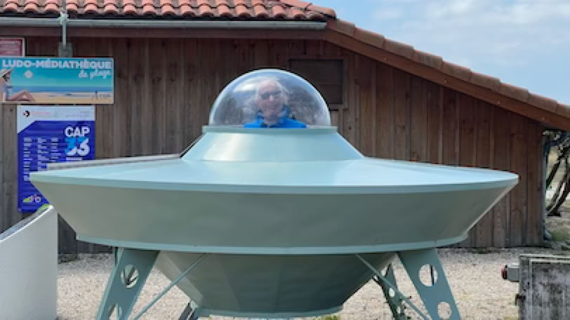Et c’est reparti à 10h pour un tour du Bassin à vélo, sur notre itinéraire «traditionnel» cette fois. Première petite étape à Biganos (25 km) dans une boulangerie pour acheter des sandwichs et des boissons, et prendre un café. Puis la très longue ligne droite du fond du Bassin. Arrivé à Andernos les bains (45 km), nous allons jusqu’à la jetée pour prendre quelques photos, mais nous poussons jusqu’à Ares, que nous ne connaissons pas encore, pour notre pause déjeuner. Arrivée au bord de l’eau (enfin, c’est une façon de parler : la mer est basse, partie très loin de la côte), nous prenons des photos rigolotes dans la soucoupe volante qui ressemble fort à celle de La Soupe aux Choux, puis nous nous asseyons sur un banc à l’ombre des grands arbres pour notre pique-nique. Et après, un café, nous reprenons la route vers la plage du Truc-Vert, au Nord du Ferret. Sous les pins, la piste cyclable est défoncée et parfois le macadam a disparu. Nous arrivons néanmoins sans problème au Truc-Vert. La plage est toujours magnifique avec une très belle couleur de l’eau et de belles vagues. Par contre énormément de monde (beaucoup d’allemands). Nous profitons néanmoins de l’eau et du soleil pendant une bonne heure et demie. Je joue dans les vagues … dans la zone surveillée.