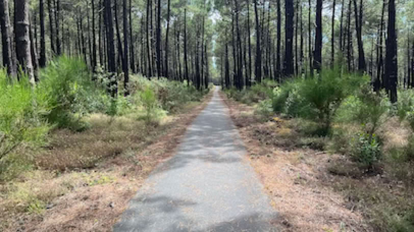 C’est un peu à la dernière minute que nous décidons d’une randonnée à vélo jusqu’à Biscarosse, Biscarosse Plage d’abord et Biscarrosse Bourg ensuite. Mise à part les côtes jusqu’au plages de l’Océan, ça devrait être assez plat et pas trop dur malgré la distance prévue (plus de 45 km). La randonnée commence donc normalement, avec le Pyla et la piste cyclable qui monte et descend au milieu de la forêt disparue, puis le long des plages de la Lagune, Salie Nord et Sud. Puis une longue ligne presque droite et plate jusqu’à Biscarosse Plage, sous la forêt intacte cette fois-ci. Là nous faisons une petite pause dans une boutique-bar avant de reprendre la route vers Biscarosse Bourg à 13 km de là … Nous tombons sur un hic tout à fait imprévu, à savoir une piste cyclable avec des côtes bien costaudes (et heureusement de bonnes descentes qu’il faudra gravir au retour …). C’est donc bien fourbus, après 45 km que nous arrivons au centre de Biscarosse Bourg. Rien de bien extraordinaire en ville à part une quantité astronomique d’agences immobilières. Petite pause en terrasse d’un café. Puis nous reprenons les vélos pour le retour. Nous sommes déjà bien fatigués et nous faisons une pause le long du lac, sous les arbres. Baignade dans l’eau chaude mais peu profonde du lac, repos sur nos serviettes, à l’ombre des pins … et c’est reparti. Et il faut effectivement remonter toutes ces descentes de l’aller. Pas facile, mais nous y parvenons comme des grands avant de rejoindre la piste qui nous ramène au Pyla. Mauvaise surprise : nous avons un bon vent de face ce qui ajoute à la fatigue. Les dernières montées vers le Pyla sont laborieuses et c’est soulagés que nous retrouvons le plat pour la traversée du Pyla. Une fois arrivés, et après une bonne douche, nous n’avons plus envie d’aucun effort ni de ressortir se promener ! Apéro et repas simple, et repos !