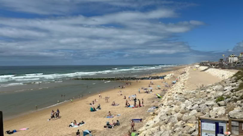 Retour à la maison pour un déjeuner simple (melon et salade de riz). Repos, sieste … A 17h, direction la plage Pereire. Comme hier, la mer est haute et le courant fort. Je fais du surplace en nageant le crawl. Puis bronzette jusqu’à 19h. La plage est calme et familiale.
