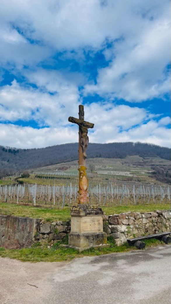 Aujourd’hui, nous allons marcher ! Pierre a trouvé un itinéraire sympa qui part du petit village alsacien typique de Kienstheim à 80 km de Colmar. Nous nous garons près de la porte de ce village. La route monte d’abord doucement entre les vignobles, puis après un calvaire, monte nettement plus fort dans la forêt. Mais de là haut, nous avons une belle vue sur les vignobles et au delà, sur les Vosges. Après deux bonnes heures de marche, nous arrivons au très typique village de Riquewihr. La rue pavée principale est bordée de maisons à colombage colorées. Peu de monde à part un groupe scolaire. Ca doit être très très différent en saison … Nous trouvons in-extremis une échoppe pour y acheter un Bretzel pour Pierre et un donut (trop gras) pour moi, histoire d’avoir quelque chose dans le ventre pour le retour. Après un tour rapide dans les petites rues, nous prenons un autre chemin pour le retour, avec un ciel qui se fait de plus en plus menaçant. En pressant le pas, nous arrivons à la voiture, à Kienstheim, alors que l’averse commence. Juste le temps de se mettre à l’abri du hayon pour changer de chaussures.