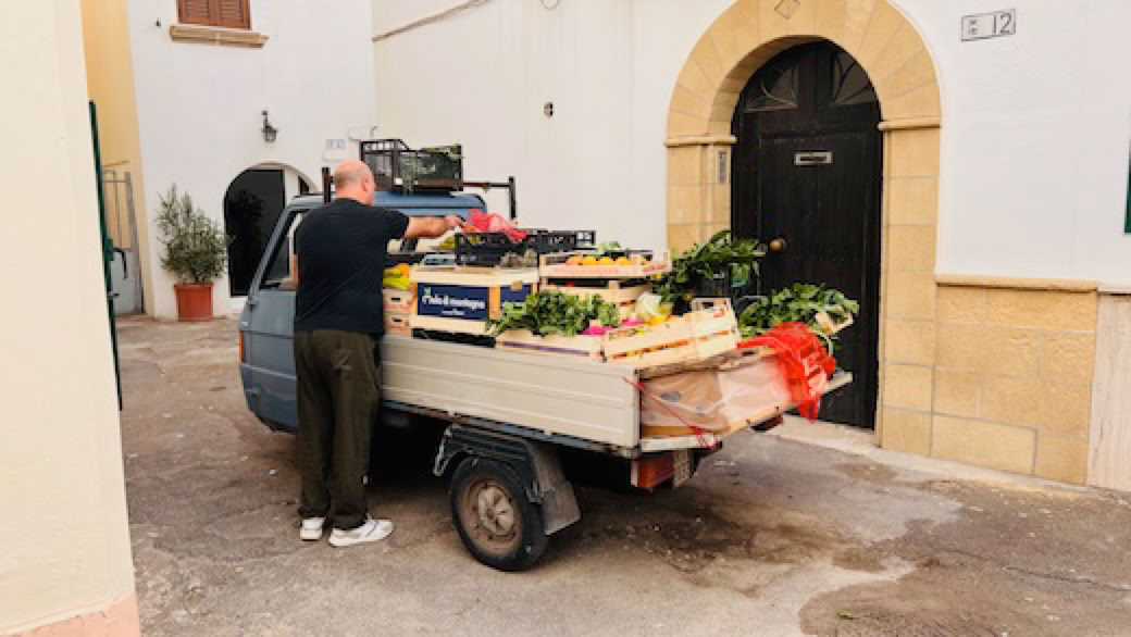 Après notre petit déjeuner dans la belle salle commune de la Casa Galateo, nous rejoignons en bord de mer les Morues U. et X. qui sont aussi en vacances dans les Pouille avec leur famille. Toujours sous un grand soleil, nous prenons un verre en terrasse, puis nous nous promenons dans la vieille ville, visitons l’église Saint François d’Assise et la Basilique Sant’Agata. Nous trouvons ingénieux le marchand de fruits et légumes ambulant en triporteur Vespa. Nous nous séparons de nos amis et prenons la route vers Leuca, la ville la plus au Sud de la botte italienne.