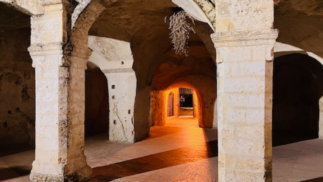 Départ de l’appartement un peu avant 7h, un coup de RER E et B pour arriver à CDG 2F vers 8h. Les bornes automatiques de Check-In sont hors-service et seulement 2 personnes aux comptoirs Air-France pour déposer les bagages … Heureusement, nous avons de la marge, et la sécurité est passée rapidement. L’avion décollera finalement avec 20’ de retard, mais grâce aux contrôleurs italiens et au vent arrière, notre A321 arrivera à l’heure à Rome et avec le beau temps ! Les bagages sont délivrés assez rapidement et avant de récupérer la voiture de location, nous nous restaurons rapidement d’une focaccia. Nous avons bien du mal ensuite à trouver les guichets des sociétés de location de voitures et après un détour par la gare ferroviaire, nous trouvons finalement le guichet Sixt, et récupérons une Jeep Compass PHEV 4x4 au lieu de l’Alfa Junior que j’avais réservée. Un peu vieille et le réservoir pas complètement plein, mais finalement, cette grosse voiture sera bien confortable et pratique sur tout notre séjour. Nous partons donc pour 5 bonnes heures de route pour descendre à Matera. Le paysage devient intéressant une bonne centaines de kilomètres avant Matera : valloné et désertique, de longues lignes droites limitées à 70 km/h … où tout le monde roule entre 90 et 100 km/h. L’arrivée à Matera n’est pas très engageante, mais notre hôtel « Casino-Ridola » est très joli, dans une grande villa au style bien italien. Nous nous installons dans notre chambre spacieuse, au plafond vouté, dotée d’une immense terrasse … et au matelas très dur. Vers 18:30 (il fait déjà nuit), nous partons à pied vers le centre historique, à 10’ de l’hôtel. C’est un choc visuel ! Un incroyable enchevêtrement de ruelles, d’escaliers, de petites maisons, de rochers, d’églises. Tout est mineral, y compris le pavage en pierres blanches des rues. En bas de la ville, un canyon. On aurait envie de tout explorer mais nous avons faim et nous trouvons un restaurant agréable, avec une terrasse qui donne sur une belle esplanade, le Keiv. Et nous dînons donc en terrasse … un 25 octobre ! Premier Spritz, du bon vin blanc, une bonne cuisine italienne … les vacances commencent bien ! Il faut quand même remonter toute la vieille ville pour retourner à l’hôtel !