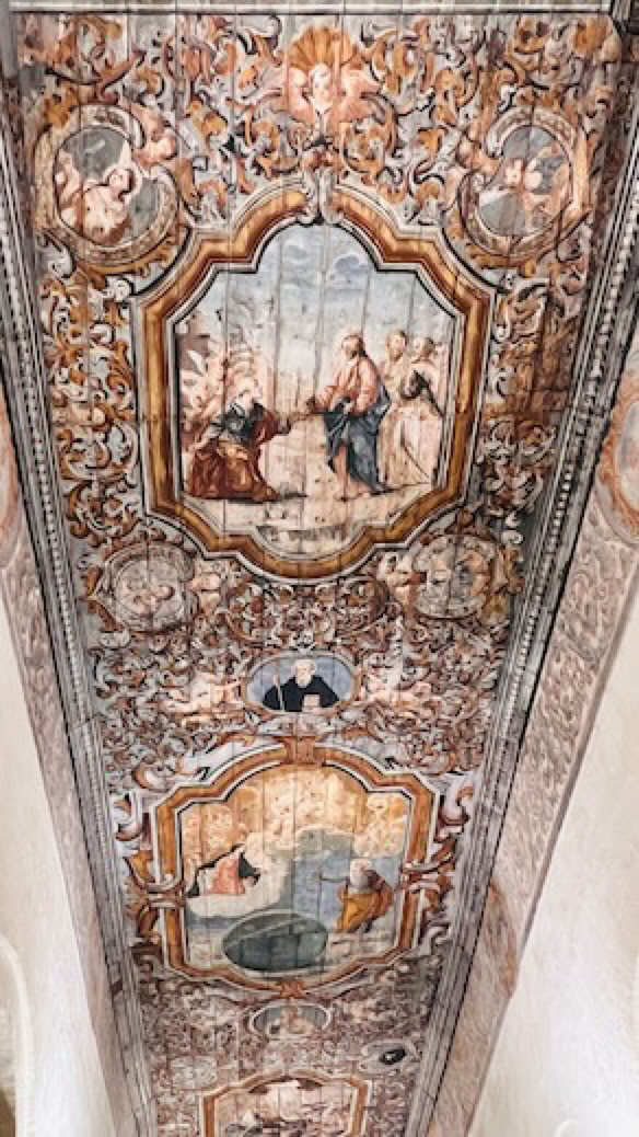 Nous partons à la découverte, en plein jour cette fois, de cette ville étonnante. Beaucoup de touristes (dont beaucoup de français, d’ailleurs). Il fait très beau, voire chaud. Nous parcourons les rues principales, pavées de pierre blanches. Nous entrons dans quelques-unes des nombreuses églises, dont la belle église romane Saint Jean Baptiste qui tranche avec les autres églises à la décoration riche et baroque. En fin de matinée, nous voulons visiter la cathédrale mais l’office dominical est en cours. Nous prenons notre café américano en terrasse en face de la cathédrale. Nous redescendons en bas de la ville par la rue pavée qui borde le canyon. Nous y trouvons le départ de la randonnée qui mène de l’autre côté du canyon et décidons, un peu à l’improviste et sans eau ni casse-croute, de faire la randonnée. Evidemment, ça descend d’abord fort, puis au fond, pour traverser la rivière, une magnifique passerelle suspendue, qui bouge bien quand on la traverse. Petit moment d’émotion … qui se poursuit car le chemin qui monte sur l’autre versant est aussi impressionnant. Le chemin passe devant des grottes qui ont servi d’habitat troglodytique, et devant une église rupestre qu’on aperçoit à travers des grilles. Une dernière échelle pour arriver sur le plateau. L’endroit permet d’avoir une belle vue panoramique sur la ville, y compris la partie la plus ancienne, abandonnée. Après un moment de contemplation, nous entamons le retour. Pierre anticipe avec appréhension le nouveau passage sur la passerelle, mais tout se passe bien, et nous revenons en ville … assoiffés. Nous nous rafraîchissons d’une limonade dans un café, nous achetons une focaccia dans une bonne boulangerie et retournons nous reposer à l’hôtel dans notre belle chambre. Vers 16h, nous retournons dans le centre pour la visite de la cathédrale et de son musée attenant. La nuit tombe vite, à 17:00, il fait déjà presque nuit. Nous visitons aussi la très jolie église Saint Pierre et Paul, avec son superbe plafond en bois peint. Pierre y met un Euro pour l’éclairer 😊. Retour à l’hôtel, j’en profite pour faire quelques brasses dans la piscine extérieure, froide. Enfin, nous redescendons en ville pour le dîner chez Francesca. La salle du restaurant est creusée dans la roche. La cuisine est excellente, le vin blanc de la région est très bon et le service agréable. Bref, une bonne adresse. C’est donc bien fatigués que nous remontons une dernière fois à l’hôtel pour une bonne nuit.