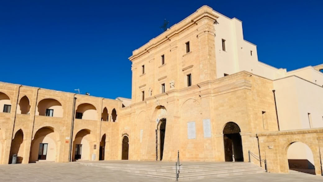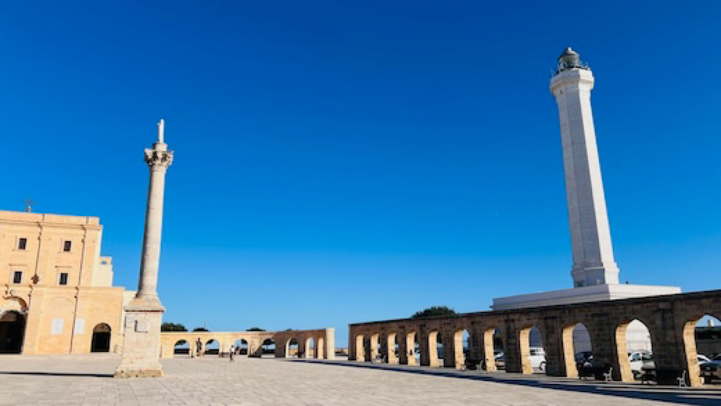 Sur le coup, la ville balnéaire nous parait déserte et nous nous promenons sur la digue. Quelques belles maison sur le front de mer. Puis nous nous dirigeons vers le belvédère à l’Est de la ville. Nous nous retrouvons au pied d’un double escalier monumental de part et d’autre d’une cascade asséchée. Nous nous essoufflons à gravir toutes ces marches et nous débouchons sur une vaste esplanade de pierre, avec le grand phare blanc, une vue panoramique qui va de la mer Adriatique à l’Est jusqu’à la Méditerranée à l’Ouest, et l’imposant Sanctuaire de Sainte Marie de la fin de la Terre (Santuario di Santa Maria de Finibus Terrae). Le sanctuaire a été consacré par Jean-Paul II et visité par Benoit XVI, excusez du peu. L’endroit est magnifique, baigné par un beau soleil d’automne.