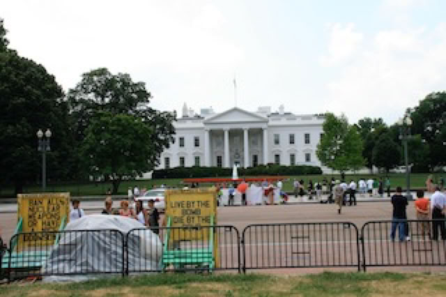Nous passons d’abord devant la maison blanche, déjà aperçue la veille lors de notre randonnée à vélo. Côté Nord, côté Sud. On aimerait bien voir évidemment Michèle Obama se promener dans le parc ou voir atterrir les hélicoptères du Président, mais ce ne sera pas pour cette fois. Manifestations silencieuses côté Nord. Snipers sur le toit, voitures de police, barrières anti-attaque : on sent la sécurité et à la fois on est assez proche de ce haut-lieu du pouvoir. Petit coup d’oeil sur le Sapin de Noël National !