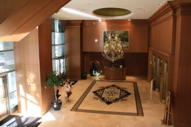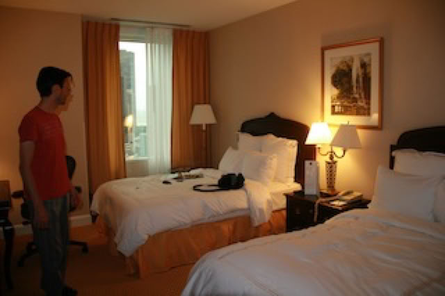 Service de «Valet» pour la voiture ($49 par jour ... mais comme dirait Matthieu, un parking normal, on n’a pas le même service !), personnel pour les bagages, grand lobby, etc ... la Classe ! L’hôtel est très plein (c’est le premier WE de vacances là bas) et on ne peut pas avoir de chambre avec des lits king-size ... mais belle consolation, on a une chambre au dernier et 17e étage (la 17-26) avec une très jolie vue. On voit des buildings, un petit bout du Lac Michigan, la piscine découverte de l’Holiday Inn ... Trés belle salle de bain aussi ... mais argh ... pas d’Internet gratuit.