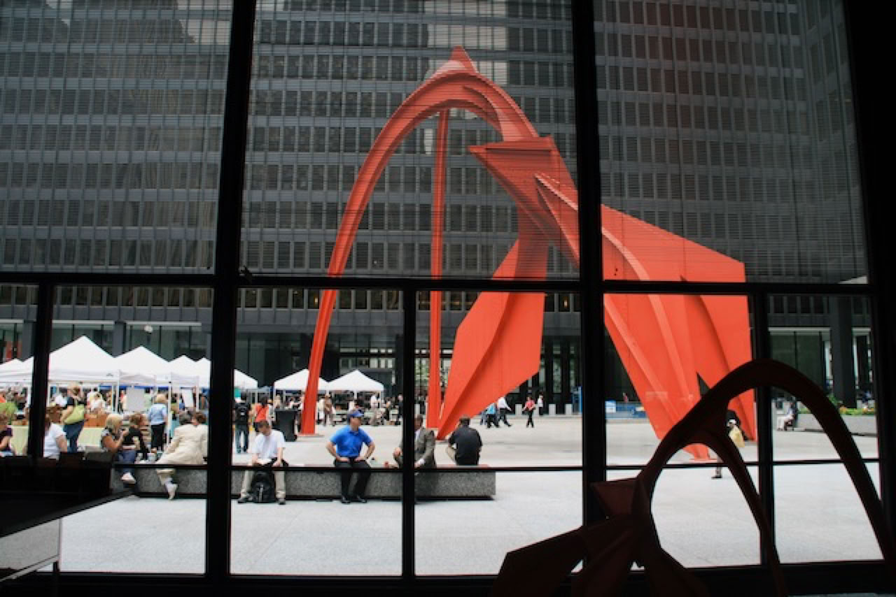 Au passage, on admire les oeuvres de Kalder (le Flamingo rouge près de La Poste), de Picasso (une tête de cheval ... sans doute, près de la mairie) et une grande fresque de Chagall en mosaïque près du Steel Building.