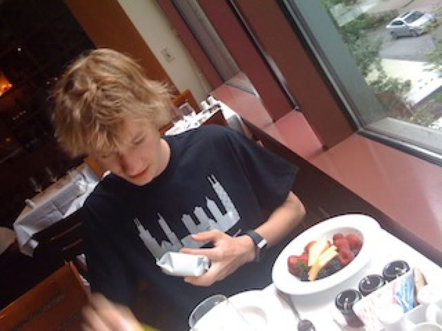 On se lève un peu tard ce mardi : Matthieu et moi sommes encore un peu fatigués de la journée à Six Flags la veille, mais Matthieu fait honneur au généreux petit-déjeuner du Winham Hôtel, surtout les fruits frais …