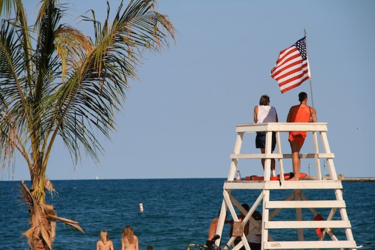 En milieu d’après-midi, direction ... LA PLAGE ! Quand même, c’est génial : il fait beau, on est en plein Chicago, le J Hancock Center se dresse juste à côté ... et on est à la plage, avec le Lac Michigan qui ressemble à la mer, les beaux maîtres-nageur sur leur guérite blanche, le drapeau américan qui flotte sur fond de ciel bleu, les jeunes et beaux américains qui jouent sur la plage, etc... Matthieu et moi nous baignons dans le Lac Michigan. L’eau est plutôt bonne.