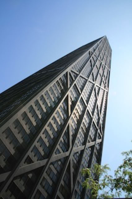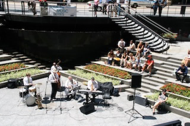 Une esplanade au pied du John Hancock Center : il fait beau, un orchestre joue, des gens dansent ... belle ambiance détendue.