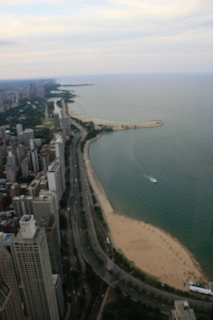 En fin de journée, plutôt que de payer pour prendre l’ascenseur à touristes, Pierre nous emmène direct au «Signature Lounge» au 96e étage du John Hancock Center (340 m) : là, on prend un verre tout en admirant tranquillement le panorama depuis nos fauteuils. La plage où nous étions cet après-midi est toute petite vue d’en haut. Le jour commence à tomber ...