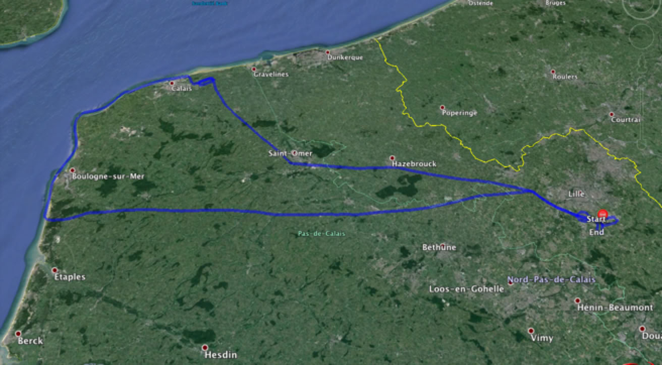 Décollage Lesquin en piste 20 en montée vers 3000 ft, Point N, Hazebrouck, St Omer puis Calais.
