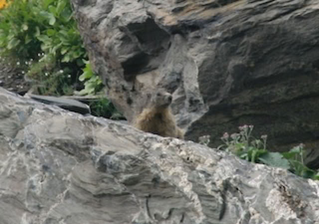 Vers 16:00 le temps se lève un peu, et puis il faut bien profiter une dernière fois de Val Thorens : départ improvisé pour une petite promenade sans but. Finalement, la petite promenade va nous emmener assez haut : d’abord à la station de départ du Funitel du Bouquetin, puis par curiosité, Matthieu veut voir de plus près l’énorme pylône que l’on voit plus haut (arrivée du Funitel ?) : ça grimpe encore bien, mais on est largement récompensé car on croise plusieurs marmottes bien dodues. Arrivée au pylône ... mais la station d’arrivée est encore un peu plus haut (au niveau du Col de la Chambre) : on hésite, mais les nuages ne sont vraiment pas loin et je décide de redescendre.