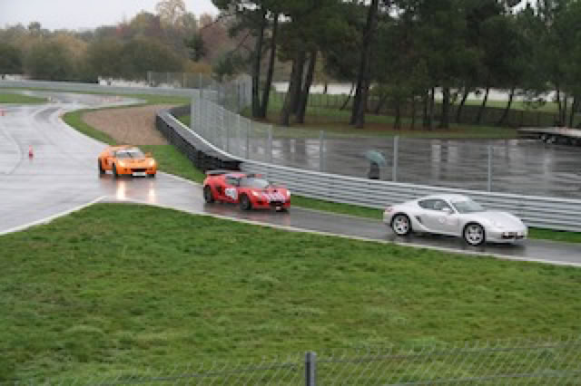 On rejoint ensuite le circuit de Lohéac ... sous la pluie (oui, on est bien en Bretagne). Il y a du monde. Inscription à 13h, briefing à 13:30: on nous explique les trajectoires en virage, les freinages, etc ... c’est intéressant et c’est globalement le contraire de ce qu’on pratique en général sur la route.