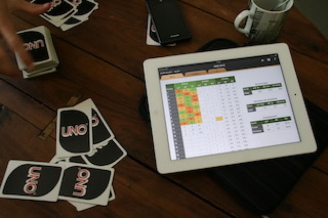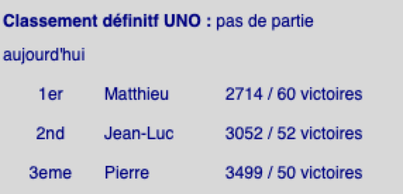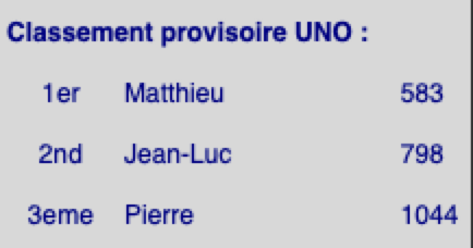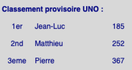 Ce soir, au UNO, Matthieu se fait prendre à son propre jeu. Après avoir truqué le premier jeu pour faire en sorte de poser une quadruple «Draw Four», pour rire, on rebat les cartes et on commence vraiment la partie ... et Matthieu se prend un triple «Draw four» 😀. Néanmoins, le classement ne change pas fondamentalement ...