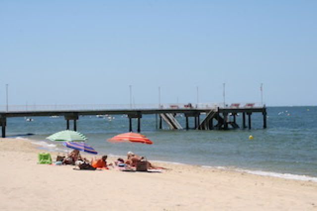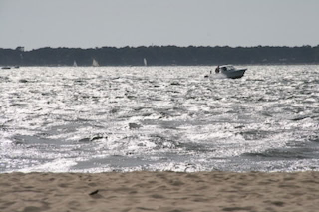 Décidément, on ne se lève pas tôt ... et certains encore moins que d’autre. Première séance plage au Mouleau pour Pierre et moi, après un petit café en terrasse. Première baignade pour moi jusqu’au petit ponton flottant. Le courant du bassin est toujours aussi fort : difficile de rester en face du même endroit de la plage, même en nageant à fond contre le courant.