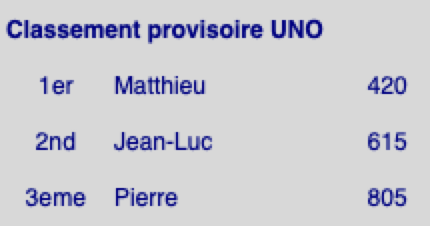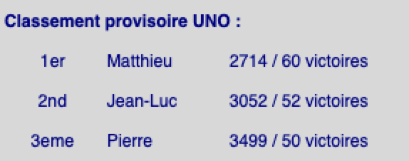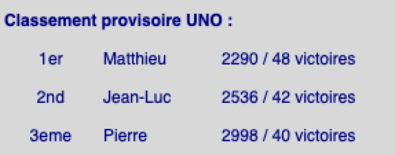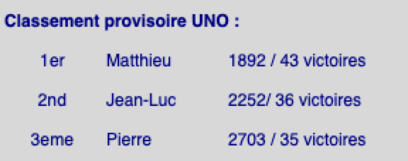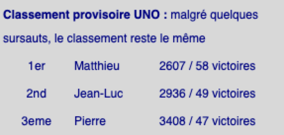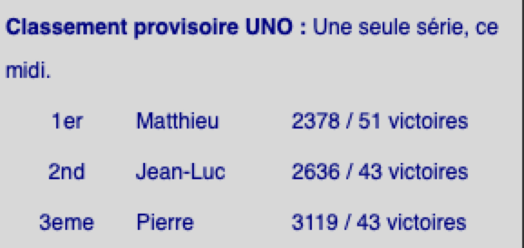 Classement provisoire UNO : malgré quelques sursauts, le classement reste le même: