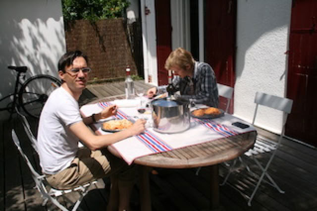 Après un 1er déjeuner dans le jardin et une petite pause, on se fait un tour à vélo dans Arcachon: ah oui, c’est vrai, ça monte et ça descend, Arcachon ! Retour et il est déjà temps de prendre le 1er apéritif, de faire chauffer le 1er barbecue et de prendre notre premier souper dans le jardin.