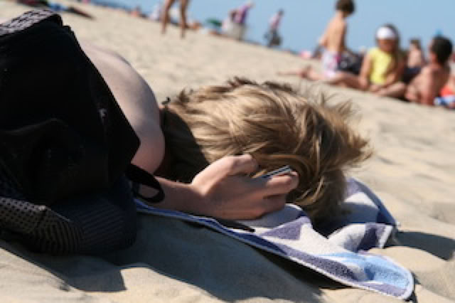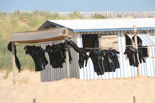 A 15h30, branle-bas pour aller à vélo à La Salie. Ca se mérite la plage : 1 heure de vélo, et ce n’est pas tout plat ! Curieusement, nous avons du mal à reconnaître la plage de La Salie : nouvelle cahute pour les secouristes (des containers habillés de pin : pas mal), mais surtout, on dirait que la plage s’est rétrécie. Certes, la mer est haute, mais quand même. On se trouve malgré tout un endroit dégagé pour une bonne séance de bronzage-lecture-sieste, entrecoupée d’une séance de saute-vagues pour Matthieu et moi. La mer est un peu fraîche au début, mais tout à fait praticable.