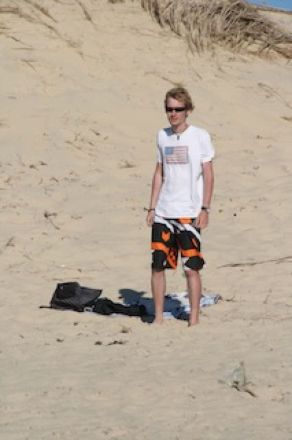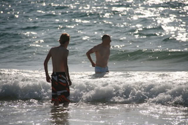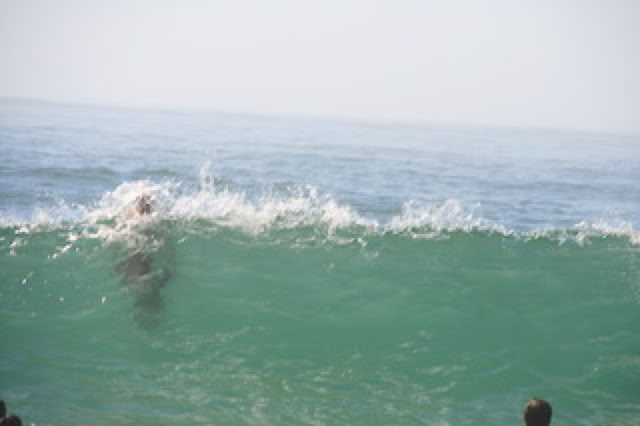 On devait se lever tôt pour aller à Cazeau ... et puis non ! Et donc, début de journée tranquille, à savoir petit-dèj, UNO, lecture ... jusque 15h30 ! Et pour une fois, on va à La Salie en voiture (avec un détour par Intermarché pour le charbon de bois et le plein de la Serie 1). Après d’âpres négociations, nous allons finalement sur la plage ... habituelle. Il y a de gros rouleaux au bord de la plage et au loin, on voit d’immenses gerbes d’eau, sans doute au niveau d’un banc de sable. L’océan est tellement agité qu’une brume d’embruns s’est formée à l’horizon. Il fait vraiment chaud, et pour se rafraîchir, Pierre s’initie aux joies du «Saute-rouleaux» et au plaisir de nager au delà de la barre.