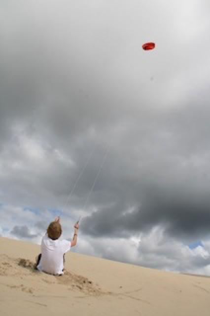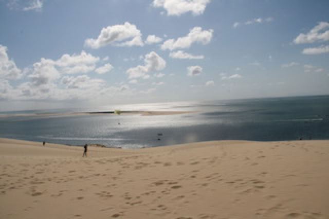 Grasse matinée pour la première journée sur place ! On traine un peu, Pierre va faire un tour à vélo, on va à la maison de presse (où j’achète un magazine formidable avec les voitures des années 70 ... Peugeot 604, Renault 30, Simca 1307, GS, CX 2000, etc. Souvenirs !). Salade de riz ... re-farniente, télé ... et c’est parti pour un tour à vélo à la dune du Pyla. On connait bien la route. Ca monte un peu et après évidemment il faut escalader la dune. On se trouve un coin tranquille avec toujours cette vue unique sur le Bassin d’Arcachon, le Cap Ferret et le Banc d’Arguin. Il y a du vent, l’occasion de sortir le cerf-volant : ça tire fort sur les lignes !