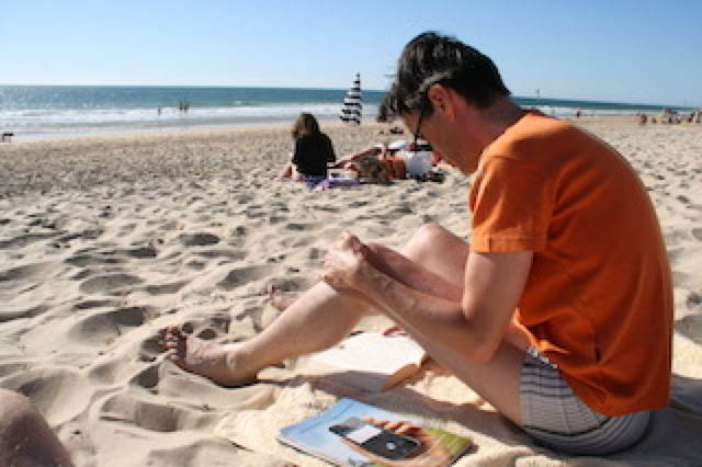 Passé 16h, on va à la plage du côté du Pyla (le quartier, avant la dune). Plage étroite surtout à marée haute, mais pas désagréable. On regarde quelques jolis bateaux du Bassin (pas des gros yachts en plastique), on se baigne un peu, on dort, on lit (Pierre commence le dernier John Irving).