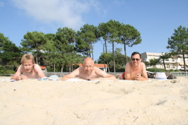 Déjeuner et une première partie de UNO qui me permet de revenir au niveau de Matthieu. Puis, plage à Pereire, mais il y a du vent et il ne fait pas si chaud que cela malgré le ciel bleu: Pierre plie bagage le premier, pas très en forme. Matthieu et moi le suivons peu de temps après, sans même nous être baignés.