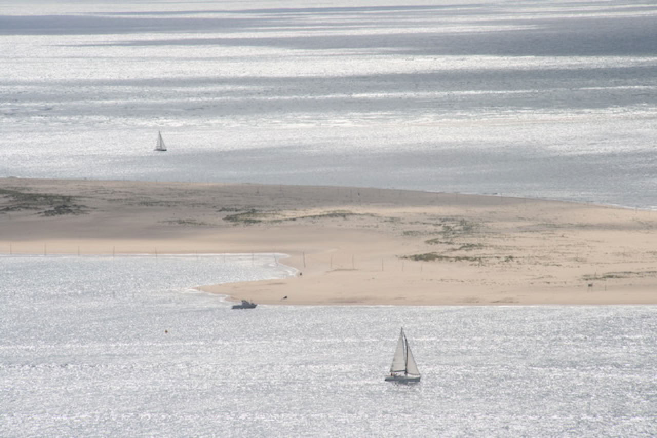 Ce tour de bassin ne fait pas 90 cm, mais plutôt 74 km, retour en bateau non compris. Levés nettement plus tôt que d’habitude (9h ...), petit déj. et mise en route. Sur le première tiers, c’est la traversée d’Arcachon, La Teste, Gujan ... rien d’extraordinaire, surtout quand on hésite sur la bonne piste cyclable à prendre. Ensuite, c’est l’interminable ligne droite qui longe le fond du Bassin : bien refaite, c’est plutôt agréable. Il ne fait pas trop chaud car le ciel est couvert en début de journée. Histoire de pimenter un peu le parcours, je fais de temps en temps la course avec Matthieu : rien à faire, il accélère mieux ! Pause déjeuner en terrasse d’un restaurant d’Andernos près de la jetée. La mer est ... invisible : marée basse et fond de bassin à découvert, sauf les quelques chenaux. On reprend les montures, cette fois jusqu’à la presqu’île du Cap Ferret. On s’arrête pour profiter de cette belle plage sur l’Océan. Plutôt agité l’Océan d’ailleurs. Le ciel est maintenant totalement découvert et il fait chaud : c’est bon, sur la plage. Retour aux vélos pour une dernière ligne droite jusqu’au Cap et la jetée Bélisaire. On prend la navette du retour. Toujours une très belle vue, depuis l’arrière du bateau, sur le Cap Ferret et en face, la Dune du Pyla.