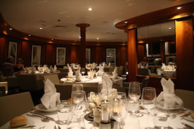 Ensuite, nous rejoignons le luxueux restaurant à l'avant du bateau: personnel philippin aux petits soins, cuisine raffinée, vin à discrétion. Nous sommes à une table de ... retraités, mais à quelques exceptions près, nous sommes de toutes façons parmi les plus jeunes! Néanmoins ces personnes sont très sympathiques: un couple de belges et un couple de Montpellier. Bref, ambiance feutrée et conversation aimable. Maintenant que le bateau navigue, ont commence toutefois à sentir un peu de mouvement ! On va très vite s’y habituer.